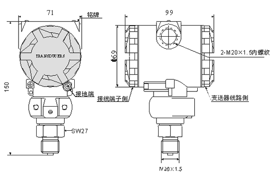 型壓力變送器。兩線制4∼20mADC電流輸出或三線制1∼5VDC電