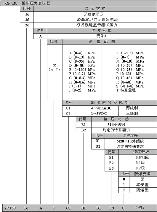 若所選測壓形式為絕對壓力,則在量程代碼後加A。以上為例,則所選編號為GPT3016AJAC1B1D1E30