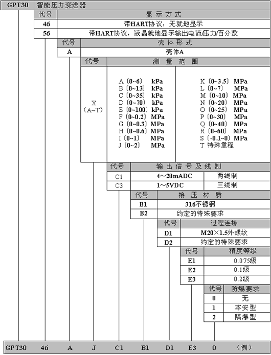 若所選測壓形式為絕對壓力,則在量程代碼後加A。以上為例,則所選編號為GPT3046AJAC1B1D1E30